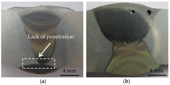 Cross-sectional macrostructures of representative welded joints: (a) sample No. 5; (b) sample No. 6.