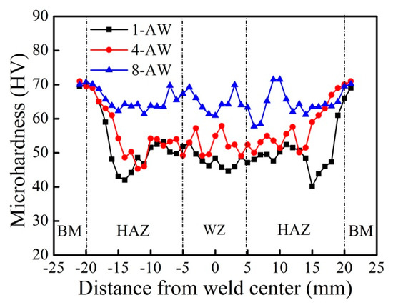 Figure 6 shows the microhardness distributions of the as-welded joints with different heat inputs during welding. It can be seen that the hardness distribution exhibited a typical “W” shape, and the minimum hardness value was located in the HAZ. This indicated that the frail position of the joints was located at the HAZ. With decreasing heat input, the minimum hardness of the HAZ increased, the distance between frail position and weld center decreased, and the average hardness of the WZ increased. At a total heat input TQ of 7126.9 kJ, the minimum hardness (40.2 HV) of the HAZ of joint No. 1 was only a third of that of the original base metal. The microhardness evolution of the welded joint can be explained by the observation and analysis of the microstructure in Figure 7, Figure 8 and Figure 9.