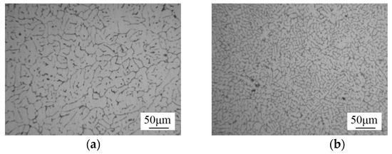 Figure 7 shows the microstructure of the weld center of welded joints (without PWHT, sample No. 1 and sample No. 8). The matrix of WZ was α-Al phase, and there were many continuous network-like eutectic Si phases distributed at the grain boundaries. As observed by OM (optical microscope) in Figure 7, the average grain size of the weld center of sample No. 1 was 37.5 μm, while that of sample No. 8 was 10.6 μm, which indicated a decrease in heat input led to the refinement of the α-Al grains in the WZ, since a decrease in heat input provided less driving force for grain boundary migration that then slowed the growth of the grains [23]. Uniform and fine equiaxed grains can be found in the central area of WZ under low heat input conditions, which then enhanced the average hardness of the WZ.