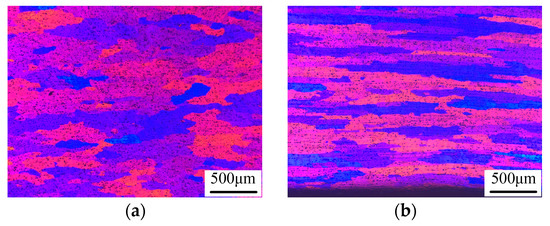 The same trend in microhardness according to Figure 6 also had been found in the HAZ. Figure 8 shows the microstructure of the frail position in HAZ of as-welded joints (without PWHT, sample No. 1 and sample No. 8). As seen from the Figure 8, the grains of the HAZ were significantly elongated in the rolling direction and they were not equiaxial [24]. The average length of the grains in the rolling direction was about 741.2 μm and the average width of grains in the thickness direction of the plate No. 1 was about 257.9 μm, while the average length and the average width of the grains in the HAZ of plate No. 8 were 1255.9 μm and 107.8 μm, respectively, which indicated that the heterogeneity of the grains in HAZ of plate No. 1 was reduced more significantly due to a high heat input during the welding process. As described in the literature [25], coarse grains especially in the thickness direction were induced in the HAZ due to the weld thermal cycle. Thus, the coarse grains in HAZ under high heat input condition could be one of the reasons which resulted in the decrease of hardness in HAZ.