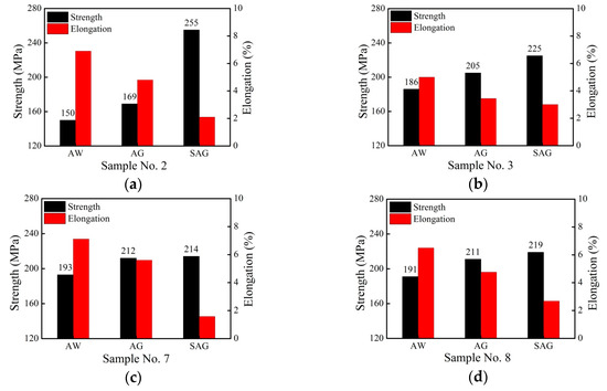 Figure 10 shows the tensile strengths and elongations of the welded joints after different kinds of PWHTs. It can be seen that the tensile strength values of AG-joints (AG: Artificial aging treatment) No.2, No. 3, No. 7, and No. 8 were higher by 12.7%, 10.2%, 9.8%, and 10.5%, respectively, than those of the AW-joints (AW: As welded). The amplitudes of ascension were basically the same (the increments were 19–20 MPa). The elongation values of AG-joints of samples No. 2, No. 3, No. 7, and No. 8 were lower by 30.4%, 31.2%, 21.2%, and 26.8% as compared to those of AW-joints, respectively. It is already known that the mechanical properties of AW-joints decrease seriously due to the aggregation and coarsening of Mg2Si particles under the welding thermal cycle. For the AG-joint, the fracture still occurred in the overaging area of HAZ and the frail position in HAZ cannot be changed. However, the reason for the improvement of the mechanical properties of the AG-joint is that artificial aging treatment can prompt a certain number of Mg2Si particles with an appropriate size to precipitate in HAZ, which can reduce the overaging degree of HAZ.