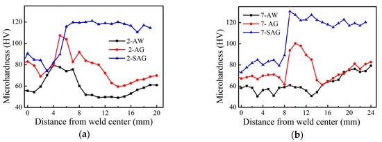 The microhardness distribution curves of welded-joints No. 2 and No. 7 under three kinds of PWHTs are shown in Figure 13. For welded joints No. 2 and No. 7, the hardness of HAZ of AW-joint was low, which was due to the coarse grains and serious overaging occurring in HAZ. As compared to the AW-joints, the hardness of HAZ of AG-joint increased to a limited extent, while the hardness of HAZ of SAG-joint was restored to the level of the original 6082-T6 base metal. Therefore, it can be concluded that the AG process improved the overaging degree of HAZ, while the SAG process eliminated the softening effect of HAZ and resulted in a uniform performance of the base metal, which was achieved by prompting all strengthening phases including coarse particles to dissolve in the matrix and to re-precipitate uniformly with refined size. In addition, the hardness of the weld center of joints No. 2 and No. 7 also increased after the AG process and SAG process, as illustrated in Figure 13a,b, which can be explained through the analysis of microstructure evolution (see Figure 14) and chemical composition (see Table 6).