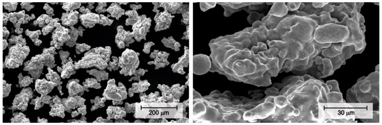 Commercially pure iron powder (WPL200, from QMP) was used for the validation of the proposed method. This irregular-shape powder (Figure 2) contains as major impurities 0.01 wt. % C, 0.2 Mn and 0.15 O. Its absolute density is 7.87 g/cm3, its apparent density [13] is of 2.65 g/cm3 and the mean particle size measured by laser diffraction is 78 μm (Malvern Mastersizer 2000, Malvern, Worcestershire, UK). The tap porosity was determined to be 0.55, following the recommendations of the MPIF Standards [14].