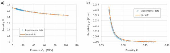 The validation of the phenomenological model will be tackled in the same way that the model has to be applied to a practical situation. Thus, in an initial experience, the parameters intervening in the model are determined, then, the model can be applied to new situations with different geometries or applied pressure, and with or without activation stage. In the initial experience, and for the compressibility test necessary to determine the curves of compressibility and resistivity, a powder mass of 14 g inside a 12 mm diameter die was used. Figure 3a shows the experimental compressibility curve and the fitting by the least squares method to the Secondi expression, Equation (4). This curve and fitting is valid for both the experiences with or without activation stage, because in both situations the powder reaches the desired porosity before the eventual activation stage. Figure 3b shows the experimental resistivity vs. porosity curve, and its corresponding fitting through Equation (5).