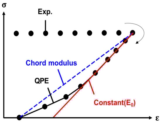 where is the Young’s modulus, is the shear modulus, and is the Poisson’s ratio. The Young’s modulus can be express by various elastic material models, as shown in Figure 1. The constant modulus model underestimates the elastic recovery, whereas the chord modulus model overestimates it. The QPE model [19] can depict the elastic unloading behaviour by introducing a QPE function and its nonlinear evolution. In the QPE model, the elastic modulus is given by:
