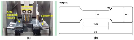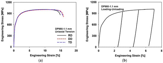 The uniaxial tensile and loading–unloading tests were carried out using a universal testing machine. The ASTM E8 standard size specimens were manufactured by wire electrodischarge machining. The effect of the coupon manufacturing methods on tensile properties were discussed elsewhere [34]. The uniaxial tensile tests were conducted for the RD, DD, and TD, as shown in Figure 2a. The loading–unloading tests were conducted for pre-strains of 3, 5, and 7% in the RD, as shown in Figure 2b. The material properties were obtained following the standard test methods ASTM E8 (Standard Test Method for Tension Testing of Metallic Materials) and E517 (Standard Test Method for Plastic Strain Ratio r for Sheet Metal), as listed in Table 1.
