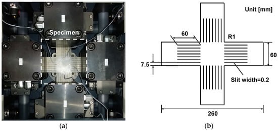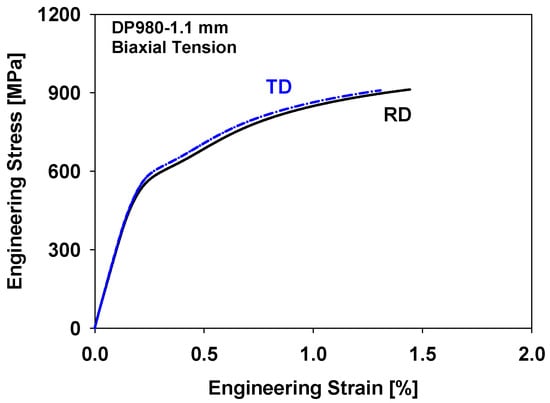 The balanced biaxial (BB) tensile test was carried out using a biaxial tensile tester [35] with a cruciform specimen, as shown in Figure 3. A constant loading rate of 9.8 kN/min was used. The plastic strain ratio in balanced biaxial tension was obtained. The results of the balanced biaxial tension are shown in Figure 4 and listed in Table 3.