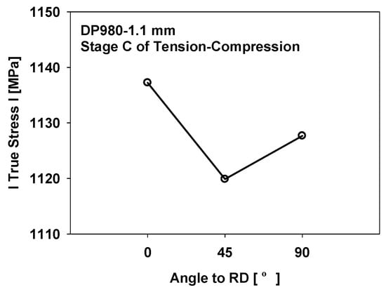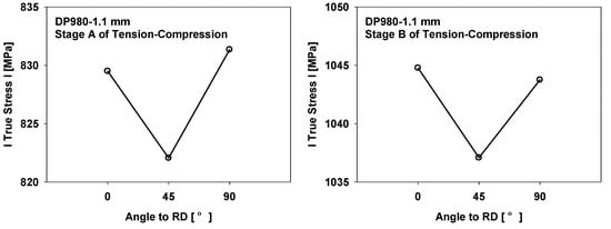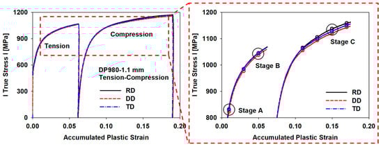 In order to investigate the anisotropic evolution of hardening, tension–compression tests were carried out in the three material directions using a tension–compression tester, as shown in Figure 6. In the tension-compression test, the sheet specimen is placed between the comb-shaped anti-buckling fixtures. Buckling of the sheet metals, which may occur during compression, is suppressed by the hydraulic force acting perpendicular to the sheet plane through the comb-shaped fixtures. Details of the tension-compression test can be found elsewhere [36]. In the tension-compression tests, the tension by a strain of 7% was followed by the compression to a strain of −7%. The true stress-accumulated plastic strain curves can be divided into three stages, as shown in Figure 7. In stage A, where hardening hardly progresses, the anisotropic tendency of yielding matches the initial yield strength trend in Figure 5a. The curves of RD and TD become similar in stage B, and the flow stress of RD becomes larger than that of TD in stage C where the initial anisotropic tendency is reversed. The change in anisotropic tendency is illustrated in Figure 8.