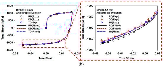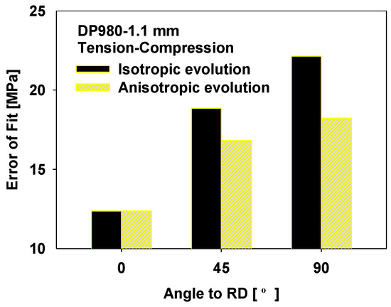 In Figure 9, the tension-compression curves in the three material directions were compared. In the case of the isotropic evolution, it follows the initial trend of anisotropy determined by the yield function. However, in the case of the anisotropic evolution, the anisotropic tendency is changed during reverse loading. The errors of fit of the tension–compression curves predicted by the isotropic and anisotropic evolution models are compared in Figure 10. The error of fit in the RD value is similar because the parameters of the isotropic model were obtained from the RD data. However, the errors in the DD and TD are smaller for the anisotropic models.