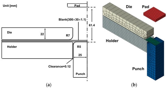 Simulations of the U-bending process were carried out using the commercial finite element software Abaqus/Standard, as shown in Figure 11b. Four-node shell elements with reduced integration (S4R) were used with an element size of 0.5 mm. The number of integration points through the thickness was seven. The coefficient of friction was assumed as 0.12. The deformation of the tools may affect the U-bending test results significantly [38]. However, for simplicity, the punch, die, and holder were assumed as rigid bodies in this work.