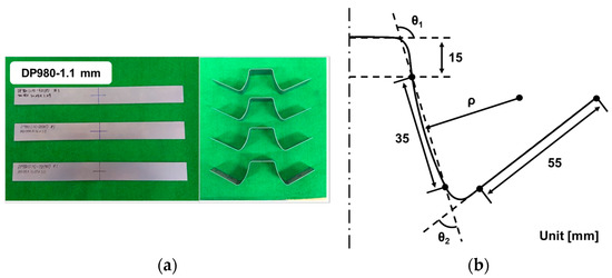 (a) Specimens of the U-bending test and (b) measures of springback (, , and ).