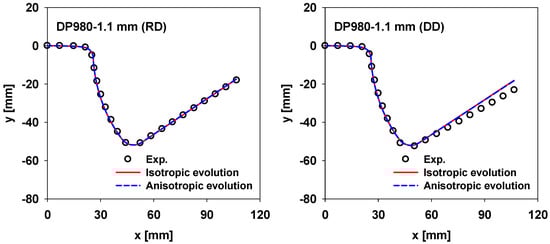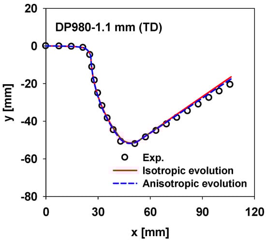The measured and calculated shapes of the specimens after springback are compared for the three material directions in Figure 13. The predicted shapes showed good agreements with the measurements in RD, while there are some differences in DD and TD. The predictions with the isotropic and anisotropic evolution showed little differences for RD because the material parameters of the isotropic evolution model were fitted for RD. However, the predictions with the isotropic and anisotropic evolution showed differences in TD, although the amount of the difference is small.