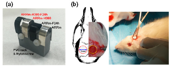In this study, the animal experiments and surgical procedure were approved by the Institutional Animal Care and Use Committee of National Cheng Kung University (approval No. 105258). Male-controlled Sprague Dawley (SD) rats were housed in an environmentally controlled animal feeding room (25 ± 1 °C, 40~70% humidity, with a regular 12 h light cycle per day) to an age of 12~14 weeks. All SD rats were randomly assigned to testing groups prior to surgery. General anesthesia was administered via an intra-abdominal injection of Zoletil 50 (Virbac, Carros, France) and Xylazine (Panion and BF Biotech Inc., Taipei, Taiwan) mixture (0.2 mg/100 g of Zoletil 50 and 0.5 mg/100 g of Xylazine); then, local infiltration anesthesia (xylocaine, 0.2 mL for each surgical incision) was performed at the surgical sites before surgery. An incision along the periphery of the skull was created to peel back to the anterior portion of the skull. Two 5 mm critical size defect (CSD) were drilled in the calvarial bone using a trephine bur and low speed handpiece (as shown in Figure 2b). While drilling the cranial bone, sterilized saline was continuously injected to cool the drilling heat. The defects were covered with the regeneration membrane (a circular foil 7 mm in diameter and 0.4 mm thick) made by ECO505 raw material. Control and experimental groups (ARRm-H380 and ARRm-H380-F24 h) were employed to realize the applicability and performance of the regeneration membranes. After surgery, the wounds were closed by 5–0 non-absorbable silk sutures and antibiotics applied to prevent wound infection. At least four SD rats are examined for each group and time point (n = 4).