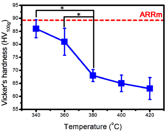 Figure 4 shows the hardness variation curves of the ARRm samples isothermally heat treated at 340, 360, 380, 400 and 420 °C for 1 h. For the specimens heat treated at 360 °C, the hardness value slightly decreased to 85 HV, which indicates insufficient solid solution efficiency. The hardness value decreased with increasing heat treatment temperature, particularly for specimens heat treated at temperatures higher than 380 °C. For the treatment temperature of 380 °C, the matrix was significantly softened (65 HV) than 340 °C and 360 °C treated groups. This phenomenon also means that the brittle secondary phases can be easily dissolved at 380 °C; therefore, we selected the temperature control of 380 °C for the ARRm heat-treatment process.