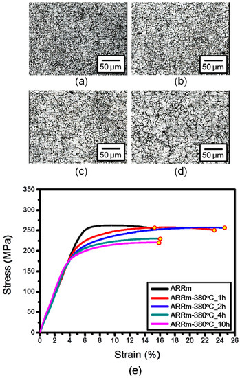 Typical microstructures and tensile stress-strain curves of each groups: (a) ARRm-380 °C_1 h; (b) ARRm-380 °C_2 h; (c) ARRm-380 °C_4 h; (d) ARRm-380 °C_10 h, (e) stress-strain curves