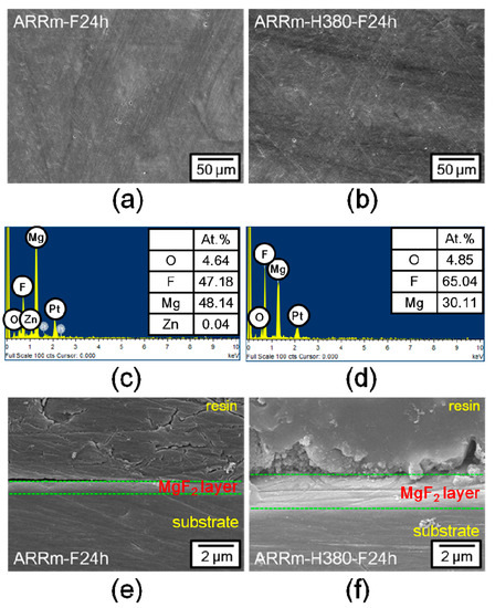 Figure 6a,b show the surface morphologies of the fluoride coatings deposited on the ARRm and ARRm-H380 substrate (named ARRm-F24 h and ARRm-H380-F24 h, respectively). The coatings on both surfaces were neat and clean, without obvious coating defects or particle contaminants. The growth reactions of the fluoride conversion coating on the magnesium surface are described in the following: