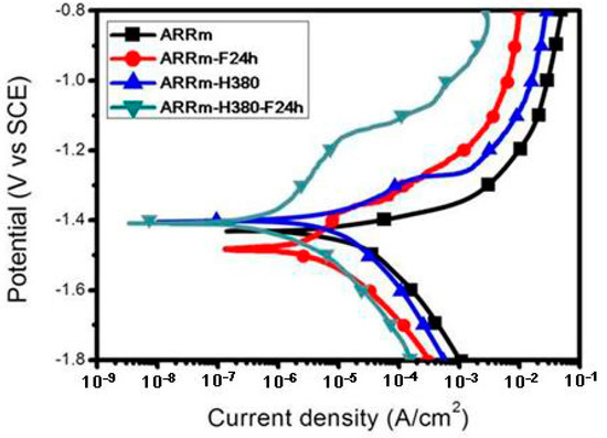 - ARRm-H380 can form a better fluoride coating quality on substrates than non-heat-treated ARRm substrate, thereby showing a higher gain of PE value (93.8%) and corrosion resistance (56 kΩ·cm2).