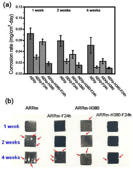 The un-bent/immersion experiment was carried out at 37 °C in r-SBF for 1, 2 and 4 weeks. Figure 8a shows the corrosion rate data calculated from the normal/immersion test. During the testing period, the corrosion rates of the modified samples were significantly higher than those of the unmodified samples, the corrosion-trend sequence of which from fast to slow corrosion is: ARRm > ARRm-H380 > ARRm-F24 h > ARRm-H380-F24 h. In addition, the corrosion trends of the immersion and electrochemical tests were identical. Figure 8b shows typical corroded surfaces of the different samples tested in r-SBF. The surface corrosion morphologies of the ARRm-H380 and ARRm-H380-F24 h specimens after 1, 3 and 7 days immersion shows the most homogeneous corrosion morphology. By contrast, localized corrosion, characterized by severe oxidation from the surface to the interior of the matrix, can be observed in the ARRm and ARRm-F24 h samples.