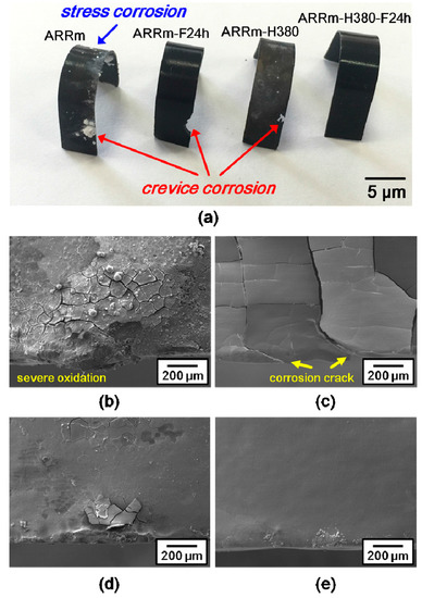 The pre-bent/immersion test examined specimens: (a) macrograph; and micrograph of (b) ARRm; (c) ARRm-F24 h; (d) ARRm-H380; (e) ARRm-H380-F24 h.