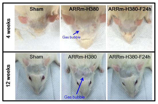 During the implantation period, all experimental rats showed good health and wound healing until the end of this research. There were no severe side effects, obvious weight reduction, allergies, rejection and postoperative infection in the rats. Figure 11 shows the hydrogen accumulation phenomenon in the ARRm-H380 group after 4 weeks and 12 weeks of implantation. As can be seen, the photograph shows that ARRm-H380 produced a subcutaneous hydrogen gas cavity, indicating that the degradation amount of ARRm-H380-F24 h was significantly lower than ARRm-H380. The generation of hydrogen gas cavity is inevitable, due to the nature of Mg corrosion. This issue might cause swollen feeling at implanted area. Fortunately, swollen feeling can be minimized by subcutaneous puncture procedure (to leak the hydrogen cavity).