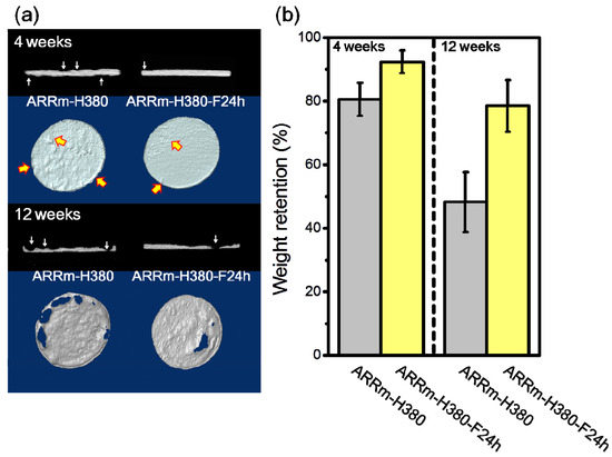 As shown in Figure 12, the difference in degradation between ARRm-H380 and ARRm-H380-F24 h lies in the corrosion behavior. Whereas the ARRm-H380 sample showed a homogenous corrosion morphology, resulting in an evenly corroded cross-section, the ARRm-H380-F24 h specimen showed a localized corrosion morphology due to the corrosive factors penetrating into the substrate at the weak points in the fluoride coating [29]. Therefore, the weak points corroded first, after which they evolved into localized corrosion pits and/or holes. Furthermore, the thickness and weight retention of the degraded ARRm-H380-F24 h was significantly thicker and heavier than the degraded ARRm-H380, which means that the degradation and amount of released Mg ions of ARRm-H380-F24 h were relatively lower than for ARRm-H380.