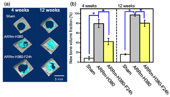 Figure 13 presents the 3D reconstruction images derived from the μ-CT analysis. The sham group showed no significant new bone regeneration; a bone fracture of the 5 mm size-level defect can not be healed because the rat cranial bone lacks blood supply and muscle tissue. However, a remarkable new bone-regeneration phenomenon can be observed in the ARRm-H380 group after 4 weeks and 12 weeks implantation. In comparison, the ARRm-H380-F24 h group showed relatively lower new bone-regeneration capability than with ARRm-H380.