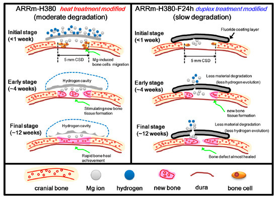In this study, we demonstrated the first report of the promoting effect for bone healing of the cranial bone in SD rats using modified ECO505 magnesium alloy to acquire the proper magnesium releasing concentration for bone tissue regeneration. According to the referenced articles and the study reported here, we created a representative illustration to demonstrate the promoting mechanism (see Figure 14). These results verified that the ARRm-H380 possessed a proper Mg-releasing ability to stimulate and enhance the regeneration of the bone defect areas, which is one of the key success factors for a GBR material. Although ARRm-H380-F24 h showed relatively lower bone-regeneration ability, its delayed degradation characterization can be effectively applied in older patients who generally require more recovery time. Therefore, this research successfully provides two future therapy solutions for different patients or therapy demands, namely short implantation period with ultra-fast healing effect, and long implantation period with moderate healing effect.