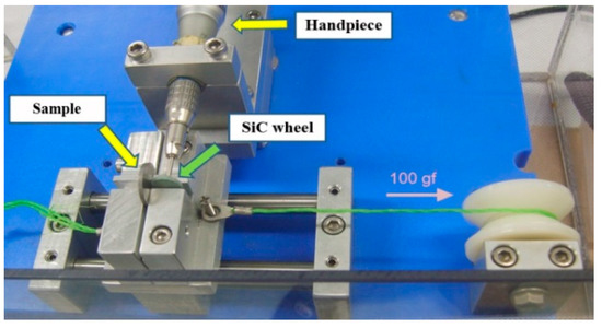 Figure 1 shows the grinding apparatus used in this study. Ti alloy disc samples were ground using an SiC wheel (703-120, Brasseler GmbH & Co., Lemgo, Germany) with a dimension of 1.5 mm thickness and 13.1 mm diameter attached to an electric handpiece of the dental motor (Strong 204, Saeshin, Daegu, Korea). A constant force of 100 gf was applied to the SiC wheel as the samples were ground [4,7,8,9,10,11,12,13,14]. The SiC wheel revolution speed was set to 5000 rpm and 10,000 rpm using a stroboscope (DX-525A, Seorim Electronics Co., Seoul, Korea).