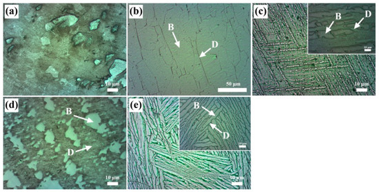 Optical microstructures of (a) cp-Ti; (b) Ti-5Al; (c) Ti-5Cr; (d) Ti-5Sn; (e) Ti-5V alloys. The micrographs of (a–e) are acquired with ×100 and ×200 objective, respectively. The insert images of (c,e) are the higher magnification (×200). The marked ‘B’ and ‘D’ mean the bright area and the dark area, respectively.