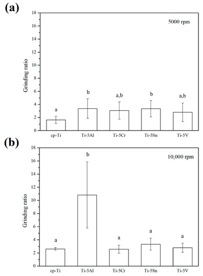 The grinding ratios of cp-Ti and Ti alloys ground using an SiC wheel at revolution speeds of 5000 rpm and 10,000 rpm (n = 7). The superscript alphabets (a,b) indicate significant differences at the p = 0.05 level according to Duncan’s multiple range tests. The mean values with the same superscript alphabet are not statistically different (p > 0.05).
