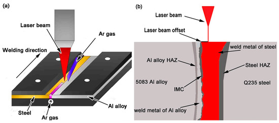 It is well known that dissimilar joining Al/steel joints is extremely challenging due to the huge disparity in thermal–physical properties between steels and Al alloys [4,8,9]. One of the main issues associated with welding Al/steel joints is the formation of thick intermetallic compound (IMC) layers at the interface [10,11]. While the IMC layer is necessary for achieving a reliable Al/steel joint, the brittleness of Al/steel joints is increased and the mechanical property is reduced if the IMC layer thickness is beyond a certain range [12,13]. The key to improving the mechanical properties of the joints is to control the formation of IMCs and limit IMCs thickness within 10 μm [14]. Therefore, considerable effort has been put into inhibiting the growth of IMC layers at the interface of Al/steel joints. The results show that welding processes allowing precise control to potentially minimize heat input (by an optimization of process parameters) are required to obtain thin IMC layers [15,16]. In view of this, a laser is regarded as a desirable heating source for joining dissimilar steel to Al alloys because of its characteristics of high power density, low welding heat input, and precise control of the location of laser focus, etc., which allow better control of the IMC layer thickness at the interface [7,17,18].