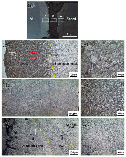 The typical cross section of an Al/steel joint with a laser beam offset 0.3 mm was observed and analyzed. Several different zones shown in Figure 7a and the characteristics of each are discussed in detail. Figure 7b,d,f presents an enlarged view of zones A, B and C as shown in Figure 7a. Figure 7b shows the microstructure of the steel-fusion zone, steel HAZ and steel base metal, showing the variation of grain morphology along with the decline of heat input. Figure 7c,e shows high-magnification microstructures of steel fusion and steel HAZ, corresponding to zones marked by white dashes and red dashes shown in Figure 7b, respectively. It can be noticed that the steel-fusion zone has a coarser lath structure, which contains martensite microstructures after rapid cooling, while the steel HAZ consists of granular bainite. Figure 7d shows an enlarged view of zone B shown in Figure 7a, and displays the typical microstructure of a steel seam which is mainly composed of columnar crystal. Grain size is from 100 to 200 μm. Moreover, columnar crystal was nearly perpendicular to the fusion boundary, which is induced by the higher cooling rate in this direction and the characteristic of the preferred growth of crystallized grains [24].