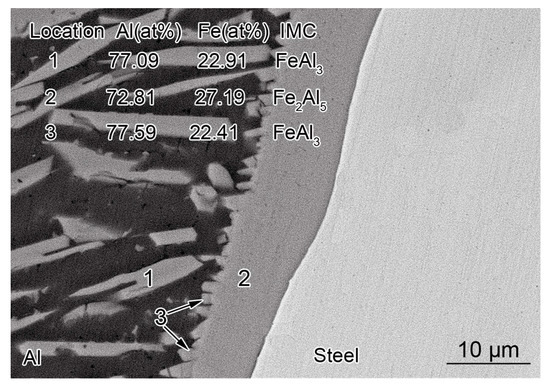 Figure 8 shows a back-scattered scanning electron (BSE) micrograph of a thick IMC layer at the interface of Al/steel butt joints produced under the same conditions of ∆d = 0.4 mm, P = 3.25 kW, f = 0 mm and v = 1.0 m/min. It was found that the IMC layers were composed of a large needle-like phase (“1”) dispersed in the Al alloy side, a compact lath structure (“2”) having a relatively smooth boundary adjacent to the steel side, and a fine serrated phase (“3”) grown from the “2” layer. An elemental composition analysis from EDS was conducted on the location “1”, “2” and “3”, and the results are shown in Figure 8. The composition of location “1” is 77.09 at % Al and 22.91 at % Fe, which is similar to that of location “3”, and the one for location “2” is 72.81 at % Al and 27.19 at % Fe. Compared to the measured composition with the Fe–Al phase diagram, the compositions of location “1” and “3” are in accordance with FeAl3, and the location “2” can be the Fe2Al5 phase. Therefore, EDS analysis shows that the IMC layers at the interface consists of FeAl3 and Fe2Al5 phases. Concerning the formation sequence and phase growth, some references have shown that the Fe2Al5 would be formed first. An indication that the Fe2Al5 is the phase that is formed first is its wavy interface towards the FeAl3, which indicates in a binary system that it was a former interface between a liquid and a solid, while the straight interface of the Fe2Al5 on the steel side indicates solid-state diffusion [35]. A further indication of the prior formation of the Fe2Al5 is the fact that each Fe2Al5 grain is a direct neighbor of several FeAl3 grains, thus it appears likely that the FeAl3 nucleated at the interface of the already formed Fe2Al5 [36].