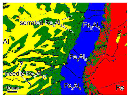 An interface region including the Al alloy, IMC layers and steel base metal was measured using EBSD phase mapping to obtain statistically significant phase information formed at the steel/Al alloy butt joints, as shown in Figure 9. The phase type of the IMC layers was accurately determined by Kikuchi patterns and the lattice constants using EBSD phase mapping performed at a selected rectangular zone near the middle part (plotted in Figure 5) of the Al/steel butt joints. The colors in phase mapping is based on a color-coded legend, in which the red, yellow, blue and green correspond to the α-Fe, α-Al, Fe2Al5, and Fe4Al13 phases, respectively. As shown in Table 2, the Fe4Al13 phase had a monoclinic unit cell with a = 15.49 Å, b = 8.08 Å, c = 12.48 Å, and β = 107.72°, and the Fe2Al5 phase had an orthorhombic crystal with lattice constants of a = 7.66 Å, b = 6.42 Å, c = 4.22 Å, and β = 90°, which is consistent with that of the previous studies [25,37]. Note that the Fe4Al13 phase here was the same as the equilibrium FeAl3 phase identified by preliminary EDS analysis. Figure 8 displays EBSD phase mapping of the IMC layers at the interface for the Al/steel butt joints obtained at a laser beam offset of 0.3 mm. According to Table 2 and Figure 8, the needle-like, serrated Fe4Al13 phase and lath Fe2Al5 phases were formed at the interface, which agrees with the early results obtained by Dybkov [38] and Shi et al. [37]. They have proposed that the reaction products are a solid solution based upon the Fe4Al13 and Fe2Al5 [15]. Therefore, by EDS and EBSD analysis, it can be confirmed that the IMC layers at the interface were composed of Fe4Al13 and Fe2Al5 phases.
