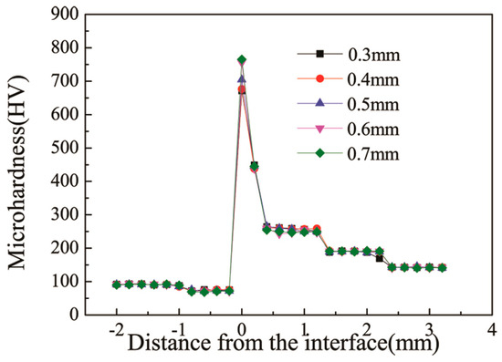 Figure 12 shows the microhardness distribution of the Al/steel butt joints with different laser beam offsets. It was found that the average microhardness of 5083 Al alloys and Q235 steels is 74.1 and 142.3 HV, while the weld and HAZ microhardness at the steel side reach 258.4 and 185.5 HV, respectively. The higher hardness in the weld is mainly caused by the steel hardening because of the quenching effect, and the high hardness in the HAZ is related to the high heating and cooling rate experienced in the HAZ resulting in a fine microstructure [40].