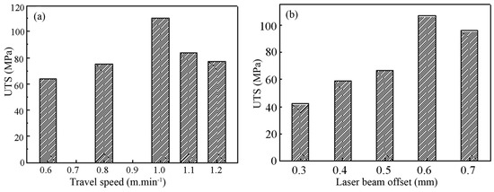 Effect of laser-welding parameters on the ultimate tensile strength (UTS) of the Al/steel butt joints: (a) travel speeds; (b) laser beam offsets.