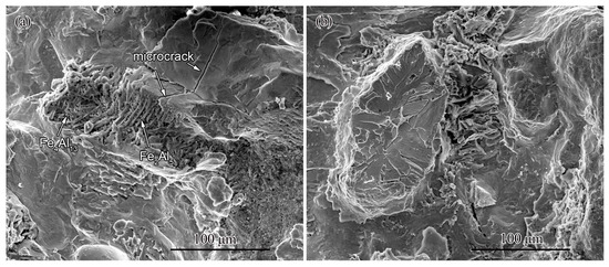 Figure 15 shows typical results from SEM investigations of fracture surfaces at the steel side and Al alloy side of the position “II” in the Al/steel butt joints, as this region is the final failure location of the joint during tensile tests. The fracture surface at the Al alloy side can be seen to be mostly flat, and the microcrack grows through the grains. Also, there was evidence of some broken Fe4Al13 phases and the needle-like Fe2Al5, as shown in Figure 15a, which depicts brittle transgranular fracture. The factographic surface in the steel side shown in Figure 15b presented the typical cleavage fracture mode, with river pattern strips of particular orientation on the fracture surface, which occupies the largest fraction area of the sample surface exhibiting interfacial failure. Even though the failure of all the samples was always located at the brazing interface during the tensile test, the specimens endured some plastic deformation, as shown in Figure 15c; some regions of the factographic surface in the steel side appear to show some dimples accompanied by some local plasticity, and the crack grew along the grain boundary, showing some intergranular fracture characteristics. Although these fractures were brittle, the latter had a certain resistance to the crack propagation of the IMC layers at the steel side, which enhanced its mechanical resistance at the steel side. As a result, the IMC layer region close to the Al base material was the most brittle region having the weakest bonding strength at the interface.