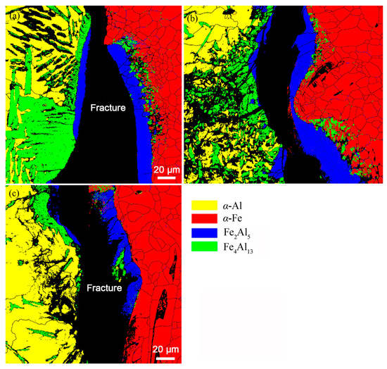EBSD phase mapping of the failed tensile samples for the Al/steel joint with different laser beam offsets: (a) 0.3 mm; (b) 0.5 mm; (c) 0.7 mm.