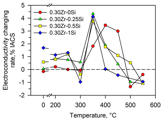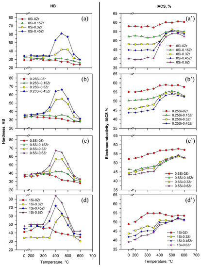 - Belov, N.A.; Alabin, A.N.; Matveeva, I.A.; Eskin, D.G. Effect of Zr additions and annealing temperature on electrical conductivity and hardness of hot rolled Al sheets. Trans. Nonferrous Met. Soc. China 2015, 25, 2817–2826. [Google Scholar] [CrossRef]
