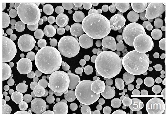 The gas-atomized and sieved under 45 μm Zr-1Mo alloy powder was prepared. The chemical composition is shown in Table 1. The Zr-1Mo powder was spherical (Figure 1), and the size distributions of d10, d50, and d90 were 15.9, 31.7, and 46.2 μm, respectively.