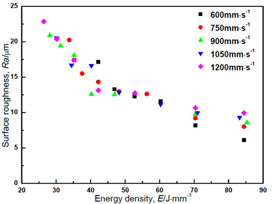 Figure 2 shows the top surface roughness of the as-built Zr-1Mo alloy with various energy densities. Basically, surface roughness decreased with the increase of energy density despite different scanning speeds. However, when the energy density was higher than 70 J·mm−3, surface roughness decreased with the decrease of scanning speed, which was confirmed by energy densities lower than 70 J·mm−3.