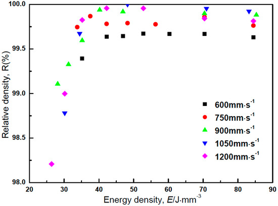 Figure 3 shows the relative density of the as-built Zr-1Mo alloy as a function of energy density. All as-built specimens had porosities of less than 2.0% within the range of tested parameters. The relative density showed a peak value of 99.9% at the energy density of 50.2 J·mm−3 using a scanning speed of 1050 mm·s−1, and then slightly decreased with the further increase of energy density, in which builds fabricated with low scanning speeds showed lower relative densities.