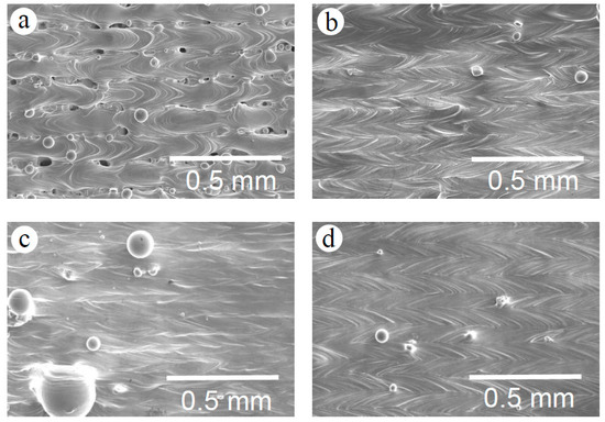 On the other hand, the balling particle zone (Figure 5) also seems to agree with the large pore zone (Figure 7), indicating that balling particles may be caused by the formation of large pores. The balling phenomenon can be explained by the stability of the liquid cylinder during PBF [33]. Stable melt tracks are crucial to avoiding the balling effect during laser scanning; however, unstable melt tracks will cause the cylinder’s diameter to oscillate, which could lead to the formation of surface waves. Gusarov and Smurov [34] reported the stability of the melt track during the PBF process using the Plateau-Rayleigh instability theory [35]. According to this theory, stable melting behavior during laser scanning could be ensured by a larger diameter of the melt track, which can be caused by a lower scanning speed. In other words, higher scanning speeds may lead to unstable melt tracks, causing the formation of balling particles. As shown in Figure 6d, the size of the balling particles was over 200 μm, which is much larger than the laser spot size of ca. 45 μm and the average powder diameter. When such large particles form on the surface during the PBF process, these particles may inhibit homogenous powder raking and melting around and beneath them. In this way, large pores are considered to be formed due to the balling particles caused by unstable melting at higher scanning speeds.