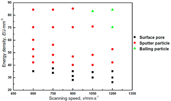 Figure 5 shows the processing map of the surface morphology at five different scanning speeds and corresponding energy densities. When the energy density was lower than 40.2 J·mm−3, the surface possessed open pores due to insufficient laser track width or a hatch distance that was too wide. When the energy density was higher than 40.2 J·mm−3, open pores became invisible on the surface, and instead, some spatter particles due to the splashing of molten metal during laser scanning were observed. When both the energy density and the scanning speed were very high, not only spatter particles but also some balling particles were observed on the surface. This phenomenon is the so-called “balling effect”, which was reported elsewhere [31,32]. The size of balling particles reached hundreds of microns, which is much larger than that of spatter particles (ca. (circa) less than tens of microns).