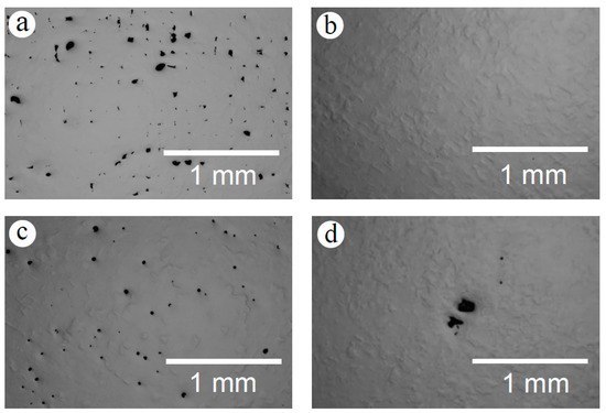 Figure 6 shows OM micrographs of the polished surface of as-built Zr-1Mo alloys with various scanning speeds. A fully dense build was obtained at an energy density of 48.6 J·mm−3, with a scanning speed of 1050 mm·s−1, and pores several microns large were observed, as shown in Figure 6b. Four kinds of pore distributions were observed, namely, grid-like distributed pores (Figure 6a), randomly distributed pores (Figure 6c), and large pores (Figure 6d).