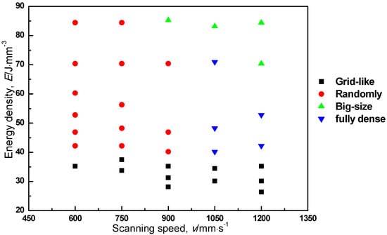 Figure 7 shows a processing map of the pore distribution at five different scanning speeds and their corresponding energy densities. When the energy density was lower than 40.2 J·mm−3, grid-like distributed pores were observed at all tested scanning speeds. Fully dense specimens, which have a relative density higher than 99.7%, were obtained by employing higher scanning speeds and a middle energy density range. At scanning speeds of less than 900 mm·s−1 and energy densities higher than 40.2 J·mm−3, randomly distributed pores with a spherical shape and a size of 10–30 μm were observed. The number of pores on a cross section perpendicular to the building direction seemed to increase as the energy density increased.