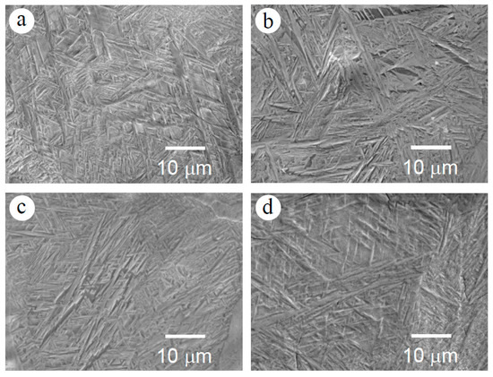 SEM images of the as-built Zr-1Mo alloys with various energy densities: (a) 35.2 J·mm−3, (b) 52.8 J·mm−3, (c) 60.3 J·mm−3, (d) 84.4 J·mm−3.