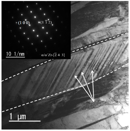 TEM (Transmission Electron Microscope) image of the as-built Zr-1Mo alloys at the energy density of 52.8 J·mm−3. The dashed lines indicate grain boundaries of an acicular crystal, and the white arrows indicate twins in the grain.