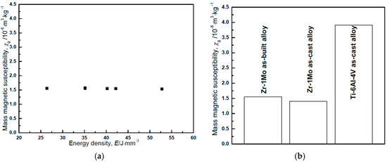 (a) The mass magnetic susceptibility of the as-built Zr-1Mo alloys with various energy densities; (b) The magnetic susceptibility of the as-built Zr-1Mo alloys averaged from specimens subjected to PBF (powder bed fusion), as-cast Zr-1Mo alloys, and Ti-6Al-4V ELI (Extra Low Interstitials) alloy.