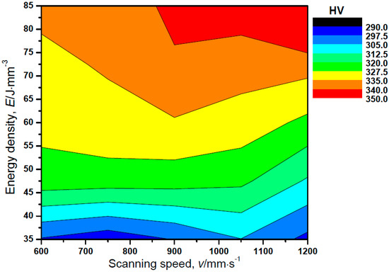 Figure 11 shows the Vickers hardness contour map against scanning speeds and energy densities. Vickers hardness was carried out for the 27 specimens to obtain the contour map. These specimens were built with different energy densities from 35.2 to 84.4 J·mm−3 and with changing scanning speeds from 600 to 1200 mm·s−1. Standard deviation of the hardness was from 3.1 to 12.8 HV. The Vickers hardness increased with increasing energy densities at the same scanning speed. When the energy density is the same, the hardness increased slightly with increasing scanning speed.